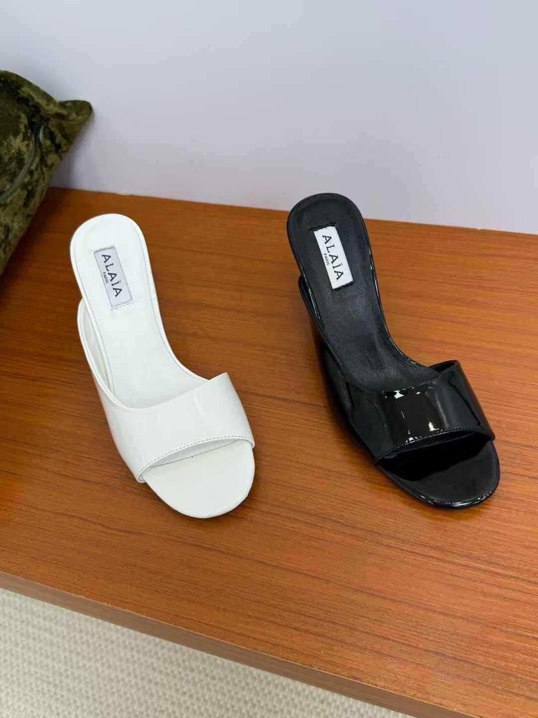 ALAÏA High-Shine Patent Slide Sandals – Black & White